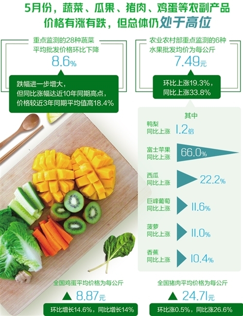 从数据来看,虽然5月份蔬菜、瓜果、猪肉、鸡蛋等农副产品价格有涨有跌,但总体仍处于高位。