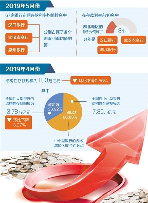 与此同时,据融360大数据研究院监测数据显示,在2019年5月份67家银行定期存款利率均值排名中,汉口银行、武汉农商行、泉州银行分别占据了各个期限利率均值第一。在存款利率前10名中,湖北地区银行占据了3个,分别是汉口银行、武汉农商行和湖北银行。湖北地区定期存款利率一直处于较高水平。