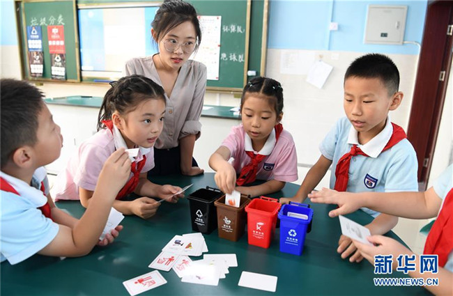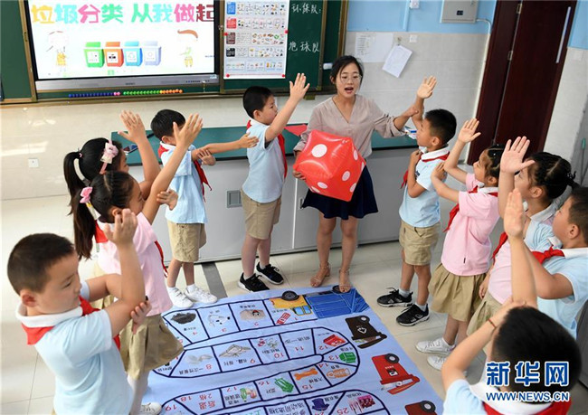 7月11日,合肥市建平实验小学学生在老师引导下参与垃圾分类小游戏。