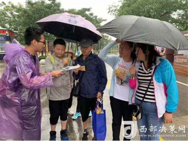 志愿者向游客宣传环保小知识并送上景区宣传彩页