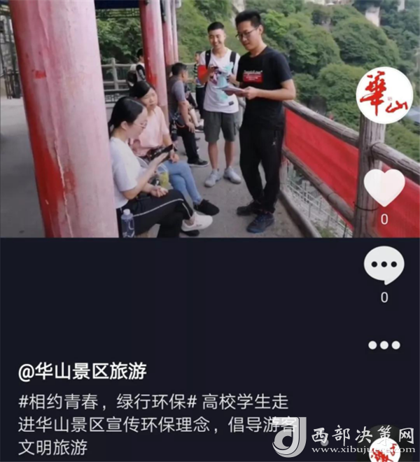 活动还通过高校网络红人拍摄抖音“青春最美,华山见证”主题短视频等传播方式,在网络线上形成热度,为华山绿色环保游提供了新方式。