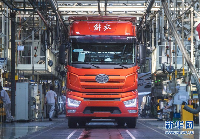 这是在位于吉林长春的一汽解放总装车间内拍摄的待出厂的解放J7卡车(6月12日摄)。新华社记者许畅摄