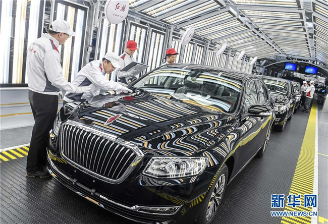 工人在位于吉林长春的一汽红旗总装车间内进行车辆静检作业(4月9日摄)。新华社记者许畅摄