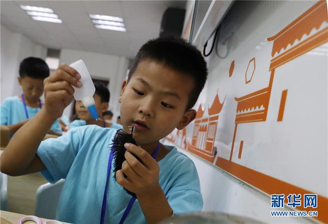 位于上海嘉定区南翔镇的南翔工业开发区,有许多来自外地的工人。暑假期间,许多小朋友从老家赶来开发区跟爸爸妈妈团聚。这些“小候鸟”的爸爸妈妈白天要上班,无暇照顾孩子,上海南翔工业开发区实业有限公司职工亲子工作室从7月初到8月下旬,在工作日为“小候鸟”们安排了丰富多彩的活动,包括做手工、学画画、练武术等,让“小候鸟”们度过一个文武双全的暑假生活。 新华社记者 方喆 摄