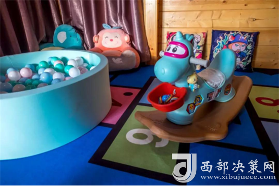 儿童休闲区以主题鲜明可爱的厚地毯作区分。休闲区有毛绒公仔、积木、卡通抱枕、小木马、舒服的懒人沙发和海洋球池,能玩能看,可以说这里的儿童设施已经全都“佩奇”(配齐)了。