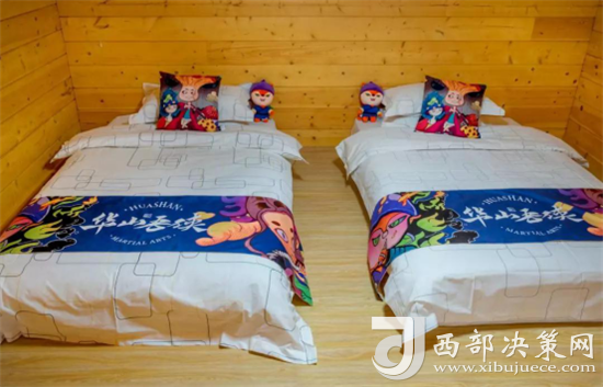 再往里边走就是大朋友(成人)的休息场所,同样以华山故事为主题布置的床,干净整洁,元素主题鲜明,床上还为大朋友(成人)准备了“华山吾侠”系列U型枕,自驾来的朋友可以带上它,来缓解因久坐开车带来的颈椎酸痛。
