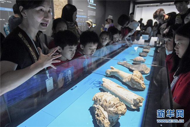 7月24日,小朋友在湖南省博物馆听工作人员讲解化石展品。