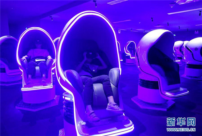 7月24日,家长和孩子在湖南省博物馆通过虚拟现实设备观影。