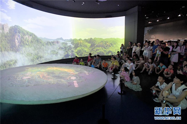 7月24日,家长和孩子在湖南省博物馆观看科普短片。