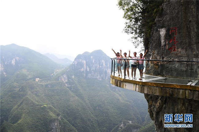 7月30日,游客在云阳龙缸国家地质公园绝壁玻璃栈道上留影。