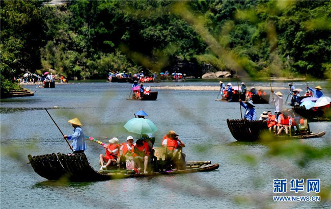 8月4日,游人乘竹筏漂流在武夷山九曲溪。新华社记者 张国俊 摄