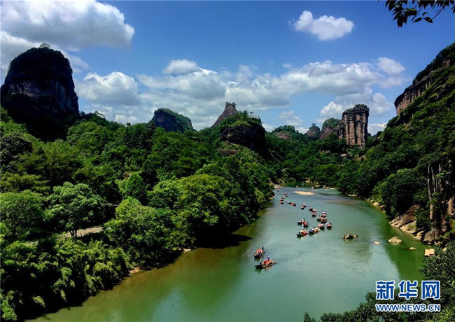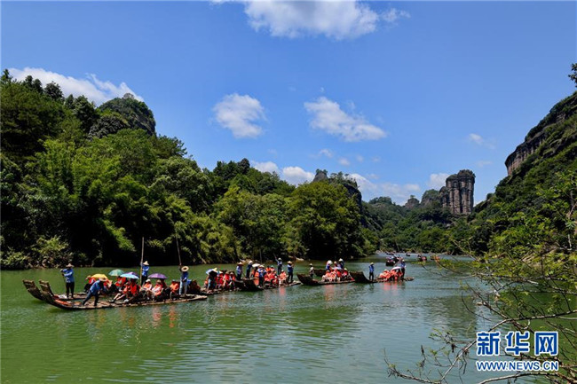 盛夏的福建武夷山,正值暑期旅游高峰,游客乘竹筏沿九曲溪漂流而下,欣赏沿岸美丽风光。