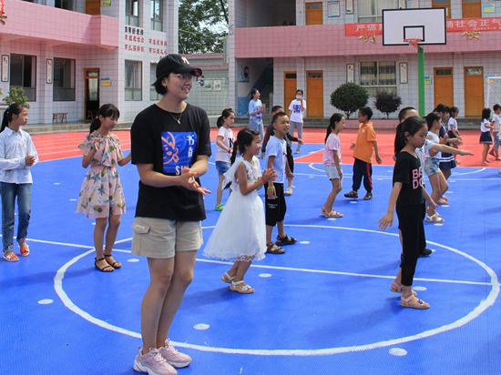 清华大学“19黔行”支教队员和小朋友们一起做课间操。邬雄亮/摄