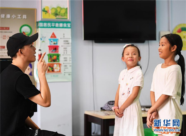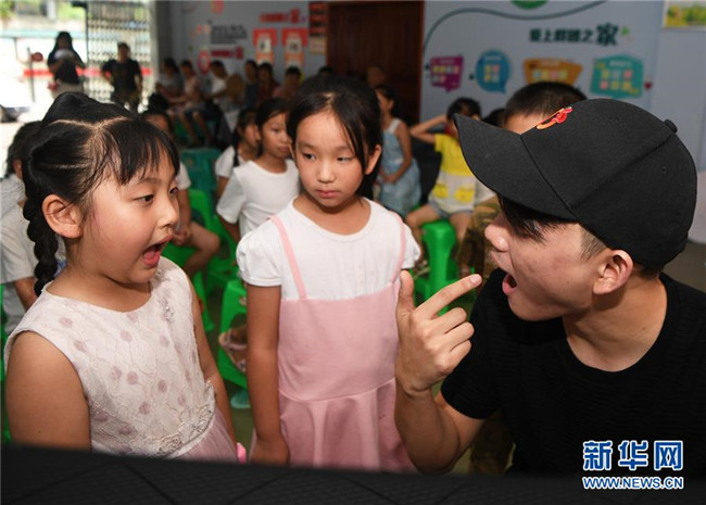 8月5日,培训班老师(左)在课堂上与小朋友们互动。新华社记者 王全超 摄