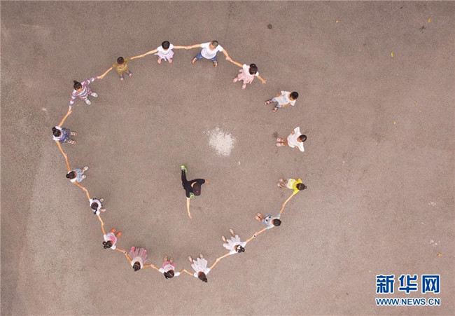 8月5日,参加音乐培训班的小朋友们和老师一起在课间做游戏(无人机拍摄)。 新华社记者 王全超 摄
