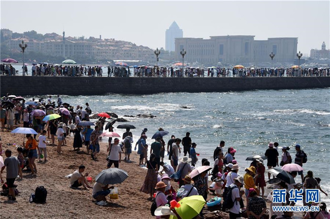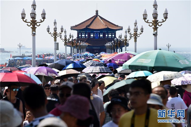 8月6日,游客在青岛栈桥景区游玩。 暑期旅游旺季,海滨城市青岛各景区、景点游人如织。 新华社记者 李紫恒 摄