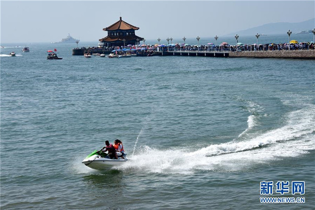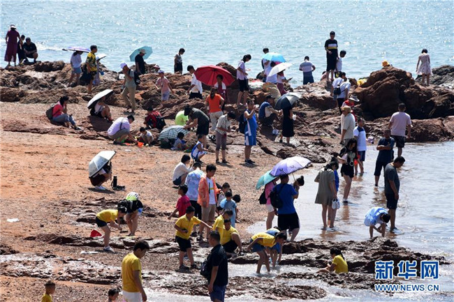 8月6日,游客在青岛栈桥景区海边游玩。 暑期旅游旺季,海滨城市青岛各景区、景点游人如织。 新华社记者 李紫恒 摄