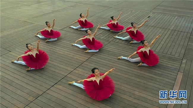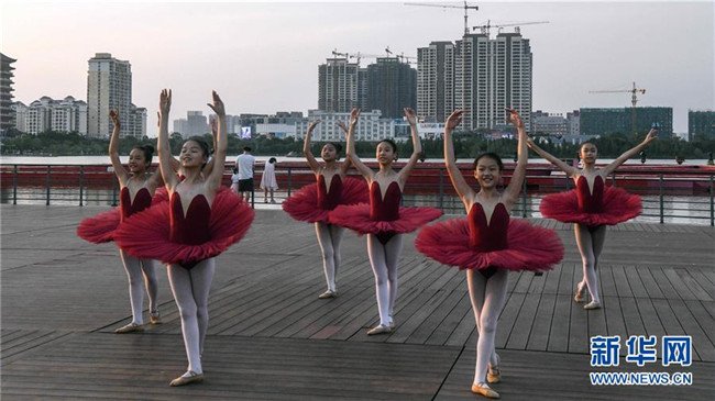 8月7日黄昏时,芭蕾小天使们在钦州市白石湖公园排练(视频截图)。新华社记者 张爱林 摄