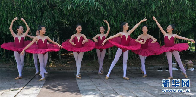 8月7日,在钦州市白石湖公园,芭蕾小天使们在练习芭蕾舞。新华社记者 张爱林 摄
