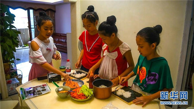 8月6日,芭蕾小天使们在同伴家中学做寿司(视频截图)。新华社记者 张爱林 摄