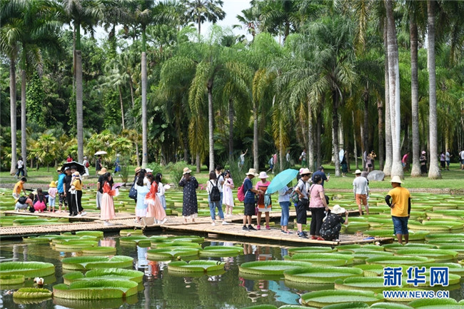 王莲原产于南美洲热带地区,西双版纳热带植物园自1963年开始引种,经过多年的培育,已成为植物园一张亮丽的名片。每年6月—10月是王莲的最佳观赏时间,不少游客都会慕名前来,观赏这种神奇的植物。新华网发(张娇娇 摄)