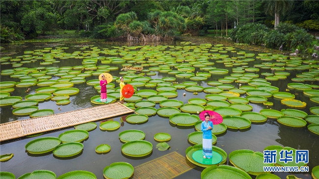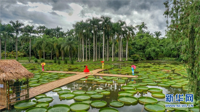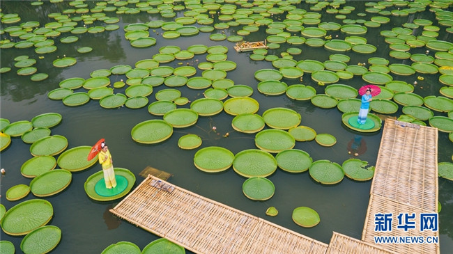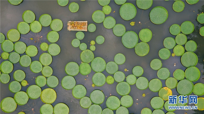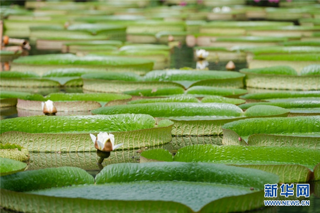 巨大的王莲叶片如同一个个绿色的大玉盘,错落有致地铺满整个水塘。新华网发(张娇娇 摄)