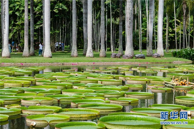巨大的王莲叶片如同一个个绿色的大玉盘,错落有致地铺满整个水塘,十分壮观。新华网发(赵熠 摄)