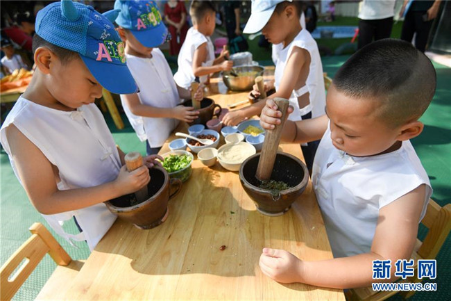 8月20日,赣州市赣县区城关幼儿园的孩子们在体验制作擂茶。