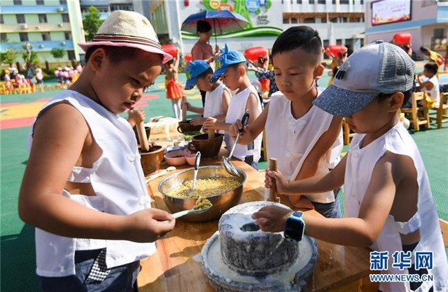 8月20日,赣州市赣县区城关幼儿园的孩子们在体验磨豆腐。