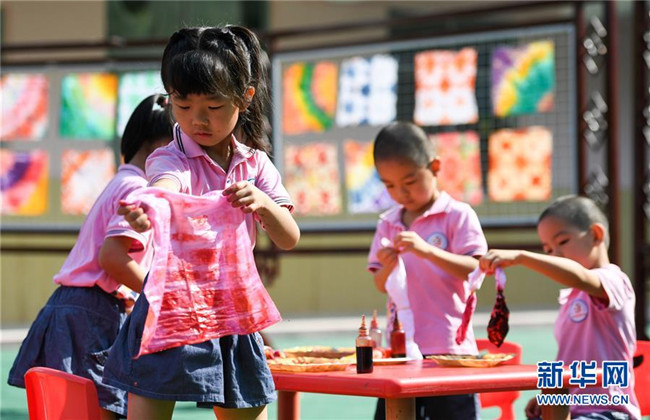 8月20日,江西省赣州市赣县区城关幼儿园的孩子们在体验客家扎染工艺。