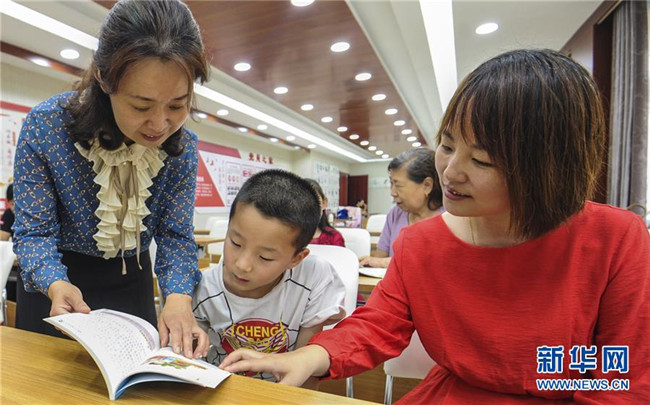 老师(前左)和家长(前右)一起在永清县城区街道公益书屋指导孩子诵读(8月20日摄)。新华社记者 李晓果 摄