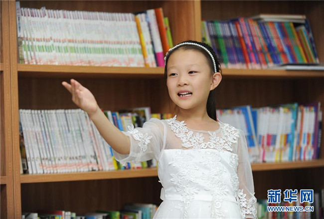 一名孩子在永清县城区街道公益书屋内诵读经典诗文(8月20日摄)。新华社记者 李晓果 摄