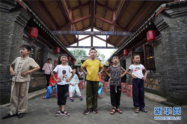 8月20日,孩子们在河北省秦皇岛市北戴河“裴艳玲艺术传承基地”学习表演京剧。