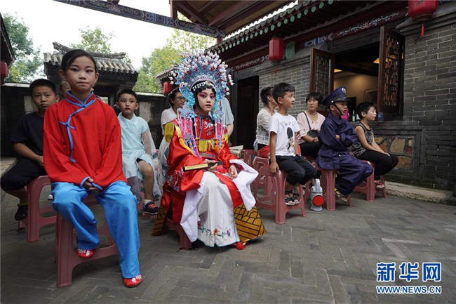 8月20日,孩子们在河北省秦皇岛市北戴河“裴艳玲艺术传承基地”观看京剧表演。