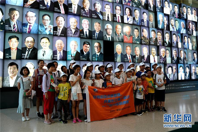 8月21日,观众在上海科学会堂的院士墙前留影。