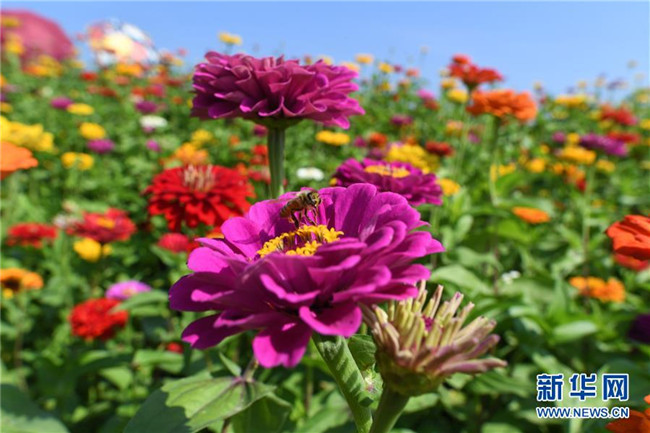 9月4日,在长春市莲花山生态旅游度假区花田,蜜蜂在花间采蜜。