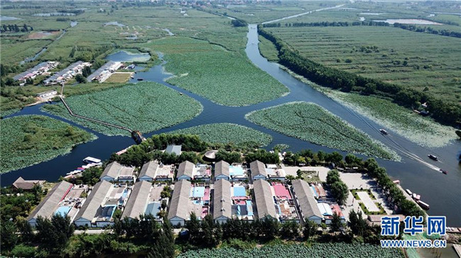 游客在白洋淀景区内游览(8月31日无人机拍摄)。 新华社记者 牟宇 摄
