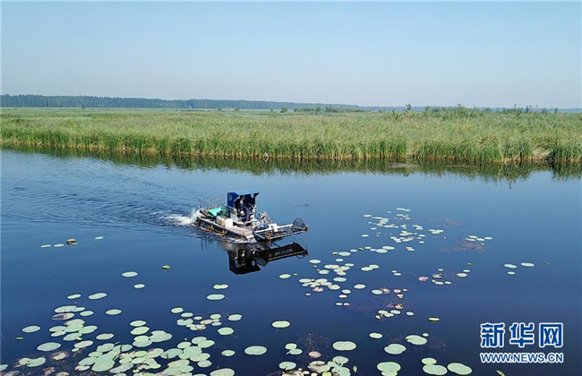 一艘打捞船在白洋淀景区内清理漂浮物(8月31日无人机拍摄)。新华社记者 牟宇 摄