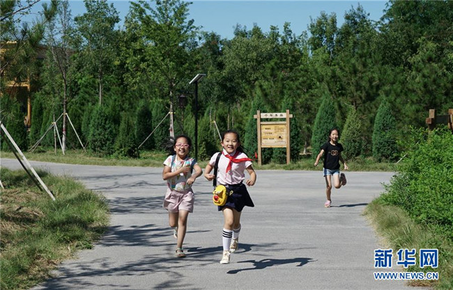 小学生们在千年秀林内玩耍(8月29日摄)。新华社记者 牟宇 摄