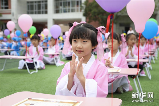 2019年9月10日,甘肃省兰州市华侨实验学校为一年级新生举办“开笔礼”仪式,让孩子们体验传统文化,迎接新的学习生涯。