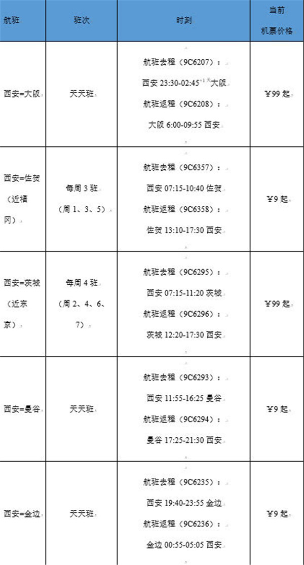 西安新开航线及加密航线详细信息