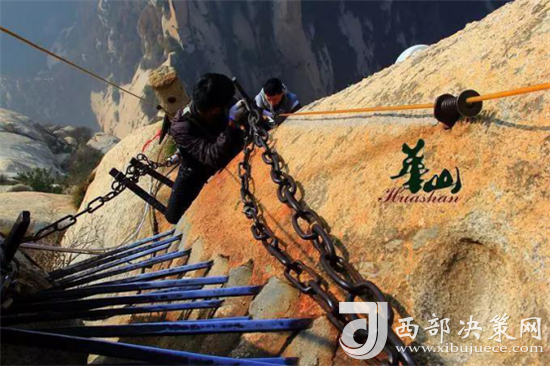 长空栈道位于华山南峰东侧山腰,是华山派第一代宗师元代高道贺志真为远离尘世静修成仙,在万仞绝壁上镶嵌石钉搭木椽而筑。栈道上下皆是悬崖绝壁,铁索横悬,由条石搭成尺许路面,下由石柱固定,游人至此,面壁贴腹,屏气挪步,被誉为“华山第一天险”。由于栈道险峻,故当地人有“小心九厘三分,要寻尸首,洛南商州”之说。这里只是探险之道,并非登山必由之路,胆小人就在升表台看看也就行了。所以石刻上不少警告之语:“悬崖勒马”等。(供稿:华旅集团营销中心)