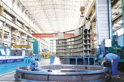 始建于1949年的济南重工集团有限公司近年来致力打造以轨道交通装备产业为核心的智能制造与高端装备产业园,老国企焕发出勃勃生机。图为2019年5月11日,工人在查看盾构机部件。张进刚摄(人民视觉)