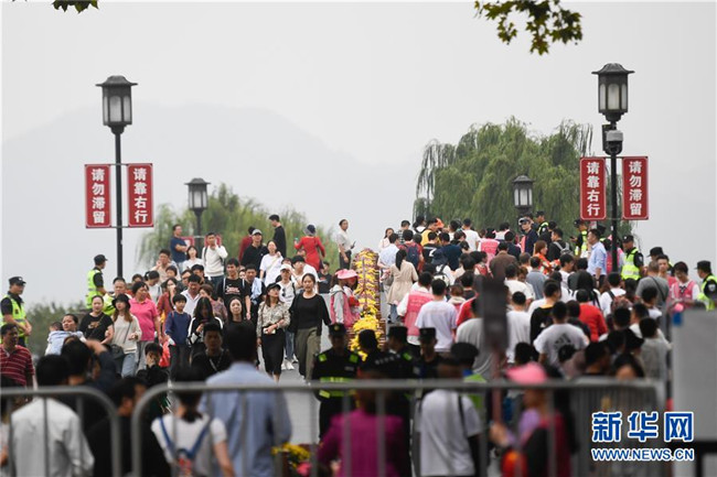10月7日,杭州西湖风景区的断桥上游人络绎不绝。经文化和旅游部综合测算,2019年国庆七天全国共接待国内游客7.82亿人次,同比增长7.81%;实现国内旅游收入6497.1亿元,同比增长8.47%。新华社记者 黄宗治 摄