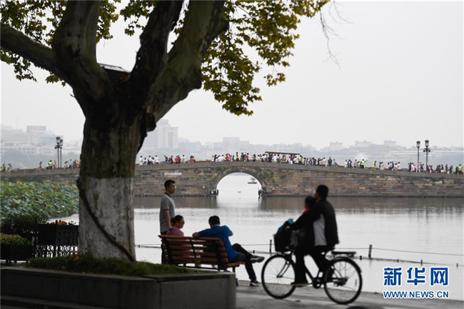 10月7日,游客在杭州西湖风景区休闲游玩。新华社记者 黄宗治 摄