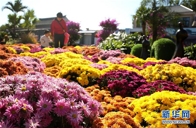 10月8日,在大厂回族自治县小厂村,游客在欣赏菊花。新华社记者 王晓 摄