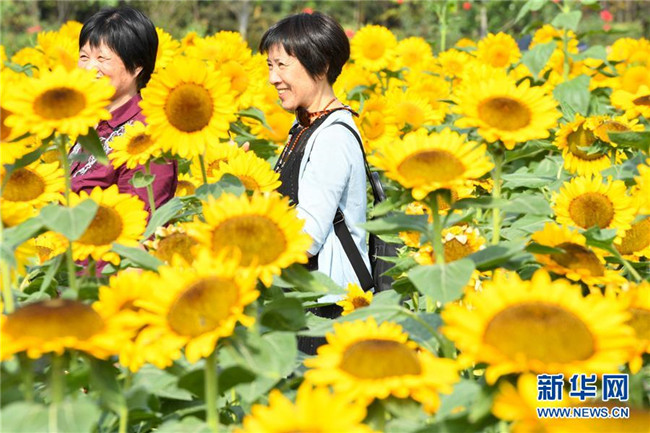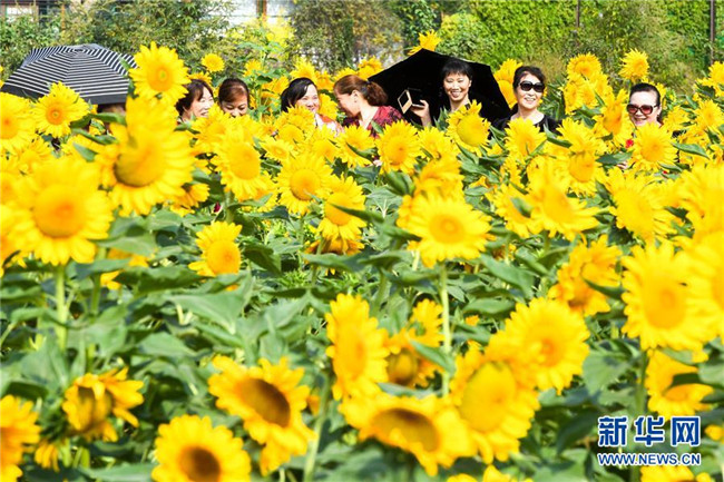 近日,位于长沙市的湖南省森林植物园中的向日葵在秋阳下竞相绽放,黄花绿叶交相辉映,吸引众多市民、游客前来观赏。
