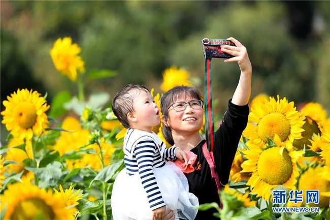 10月10日,家长和孩子在湖南省森林植物园的向日葵花海中自拍。新华社记者 陈泽国 摄