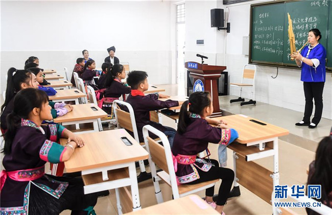 这是广西三江侗族自治县民间艺人在教江川小学学生吹奏芦笙(10月14日摄)。新华社记者张爱林摄