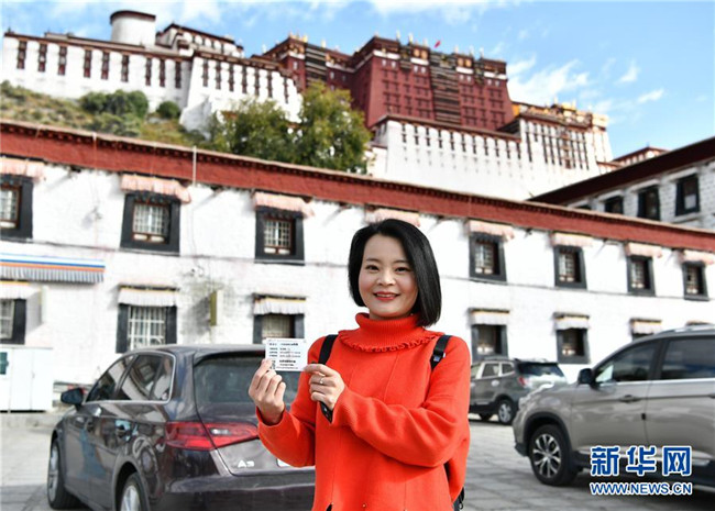 10月15日,从西宁来的游客张书培展示她用身份证换取的布达拉宫散客免费预约券。